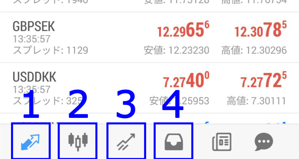 MT4アプリのメニューは①気配値 ②チャート ③トレード ④履歴 の4つから成り立っています。